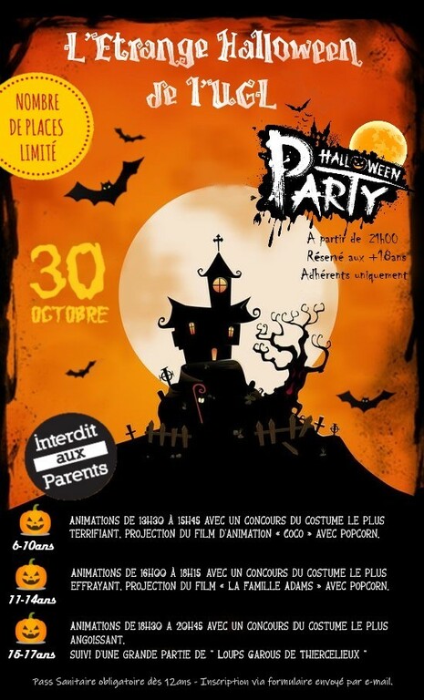 - 18h30 à 20h45 – Adhérents de 15 ans à 17 ans : concours de déguisement avec dotation de prix pour le plus affreux costumes et jeu du « Loup Garou » avec popcorn - passe sanitaire obligatoire.